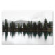 Art features reflections of dark green evergreens on a serene mountain lake under clear skies. Original art by Featherfall Studio.