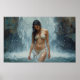 A vibrant artwork depicting a young woman standing beneath a refreshing waterfall, with sprays swirling around her in a lively summer scene that blends the beauty of nature with a spirit of adventure.