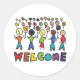 Refugees Welcome design features stick people of many colors in friendly welcoming group - celebrating diversity, new arrivals and ensuring refugees and migrants are made welcome.
