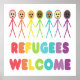 Refugees Welcome design features a diverse collection of stick people in a friendly welcoming group. The wording and colours celebrate diversity, new arrivals and aims to ensure refugees and migrants are made to feel welcome.