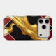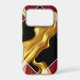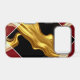 Encase your device in regal luxury with the Achempong: The Royal Flow Liquid Gold Black iPhone 17 Case. This striking abstract design merges opulent liquid gold, smooth cream waves, and a dramatic black background, framed dynamically by a white-bordered diamond shape set against a rich crimson field. The flowing, molten aesthetic creates a mesmerizing sense of high-contrast movement and modern luxury. This visually stunning art piece evokes a sophisticated, rich ambiance, showcasing high-end abstract art as a functional luxury mobile accessory.