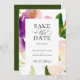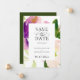 Elegant regal blooming floral, save the date wedding announcement. Artsy watercolor in shades of purple, floral bouquet with deep greenery backing colour.
