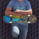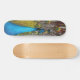 Skateboard with Original artwork of a regal peacock with his plumage on display. The iridescent tail feathers glow in shades of blue, teal, green, and purple giving this proud bird the appearance of royalty. The vibrant colours of this majestic pea fowl shine in this lifelike art that fills the entire design area.