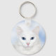 Long haired, possibly turkish Angora, blue eyed white cat face photo key chain