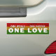 "ONE WORLD ONE PEOPLE ONE LOVE" Bumper Sticker. Bold white text. Red, green & gold background colours associated with Reggae music and Reggae culture.