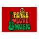 Type design of PEACE, LOVE & MUSIC with guitar, peace symbol, heart and musical notes in yellow, red and green.