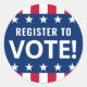Sticker featuring the text "register to vote" and stars and stripes borders.