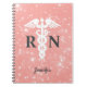 Registered Nurse Caduceus Pink Personalised notebook is a modern stylish design with rose gold blush pink and white speckled background and a white medical symbol on the centre. The text is "RN" and your name is personalised with in trendy script lettering. Great for registered nurses and nursing students.
