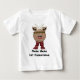 A cute reindeer with a red bow is featured on a baby's first Christmas T-shirt that you can easily personalise with baby's name!