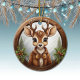 This reindeer Christmas ornament features a round, brown wooden frame with Xmas red berries and green leaves that gives it a rustic and cosy look. Inside the ornament, a cute baby animal, deer with antlers, in a cartoon graphic style, wearing a brown jacket and bow tie, standing in the foreground. The background pine trees complete the holiday season charm of this delightful unique decoration. Same Image is on the front and back. This ensures that no matter how the ornament turns, it always looks festive and complete. 🦌🎄