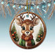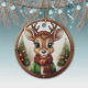 This reindeer ornament features a round, brown wooden frame that gives it a rustic and cosy look. Inside the ornament, a festive Christmas scene unfolds with a cute baby animal, deer with antlers, drawn in a cartoon graphic style, wearing a green sweater, hat and plaid scarf, standing in the foreground. The background includes soft, wintry elements like Xmas trees and distant winter snow landscape, completing the holiday season charm of this delightful unique decoration. Same Image is on the front and back. This ensures that no matter how the ornament turns, it always looks festive and complete. 🦌🎄