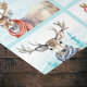 This whimsical, personalised tissue paper features your custom message and name at the top left with a cute array of lovely Christmas reindeer profiles, all adorned with Christmas decorations and winter scarves. Each panel is separated by an aqua frame, with a subtle mountain and trees watercolor look behind some of the image. Most of the reindeer pictures are just their antlers and cute faces, and in some cases scarves and ribbons, with one buck shown in full.