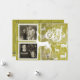 Beautiful holiday photo cards with white reindeer on a green background with muted snowflakes, text that reads Joy, and areas you can easily customise with two photos, your names, and the current year.