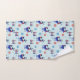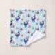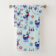 A bath towel set with a repeating pattern. Illustrated with a pair of blue scandinavian deer wearing red scarves. With decorative markings on their bodies. As well as a trio of red and blue christmas trees with a star on top. Fancy snowflakes sprinkled around.