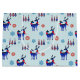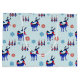 Large holiday gift bag with a repeating pattern. Illustrated with a pair of blue scandinavian deer wearing red scarves. With decorative markings on their bodies. As well as a trio of red and blue christmas trees with a star on top. Fancy snowflakes sprinkled around.