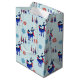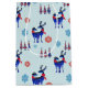 A holiday gift bag with a repeating pattern. Illustrated with a pair of blue scandinavian deer wearing red scarves. With decorative markings on their bodies. As well as a trio of red and blue christmas trees with a star on top. Fancy snowflakes sprinkled around.