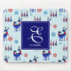 A mousepad with a repeating pattern. Illustrated with a pair of blue scandinavian deer wearing red scarves. With decorative markings on their bodies. As well as a trio of red and blue christmas trees with a star on top. Fancy snowflakes sprinkled around. A square layered over top with a personalised monogram initial and name inside.