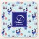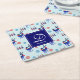 Paper coasters with a repeating pattern. Illustrated with a pair of blue scandinavian deer wearing red scarves. With decorative markings on their bodies. As well as a trio of red and blue christmas trees with a star on top. Fancy snowflakes sprinkled around. A square layered over top with your monogram initial and name inside.