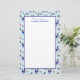 Personalised stationery paper with a repeating pattern. Illustrated with a pair of blue scandinavian deer wearing red scarves. With decorative markings on their bodies. As well as a trio of red and blue christmas trees with a star on top. Fancy snowflakes sprinkled around.