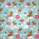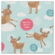 Funny flying reindeer theme with pastel blue sky, clouds and text art circles. One with text area ready for you to customise with names, Christmas greetings or fun words.