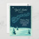 A Christmas party invitation postcard with a vintage illustration of Santa in his sleigh being pulled by his reindeers. Little stars sprinkle the night sky. Snow covered pine trees on the ground. Vintage retro feel.