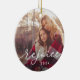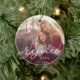 Simple and elegant holiday ornament features a photo on each side with "rejoice" overlaid in white script lettering. Personalised with the year beneath.