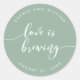 Wedding sticker featuring the words "Love is Brewing" in a relax cursive script in white against an editable background colour (click customise to access).