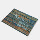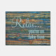 Blue, brown and yellow green coloured wooden planks pattern with "Relax... you're on lake time" quote. Decorative, cute and modern home decor product for decorating the entrance of your home, porch of your beach house, country cottage, log cabin, lake or river vacation home.