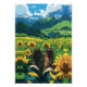 "Relaxing in Sunflower Paradise" offers a mesmerising glimpse into a moment of calm and adventure. The artwork portrays a traveller resting in a vast sunflower field, with rugged boots adding a touch of wanderlust. Towering green mountains and snow-capped peaks stand majestically in the background, all under a brilliant blue sky.