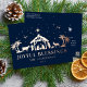 Religious Christmas Joyous Blessings Manger Holy Family Foil Christmas Postcards features a holy manger scene with Jesus with the text "Joyful Blessings" in a rose gold foil calligraphy script overlay. Personalise by editing the text in the text boxes provided. Designed by ©Evco Studio www.zazzle.com/store/evcostudio