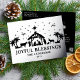 Religious Christmas Joyous Blessings Manger Holy Family Foil Christmas Postcards features a holy manger scene with Jesus with the text "Joyful Blessings" in a silver foil calligraphy script overlay. Personalise by editing the text in the text boxes provided. Designed by ©Evco Studio www.zazzle.com/store/evcostudio
