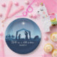 This beautiful blue drawing of the nativity scene is a gorgeous religious Christmas paper plate for a church holiday party. Unto us a child is born. Send holiday blessings with this bible verse.