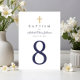 Custom Religious Cross Navy Blue Boy Baptism Table Number.