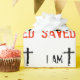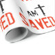 This design features the Christian phrase, "I am saved" in red and black letters, along with a black cross.