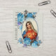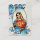 Beautiful vintage image of the Blessed Virgin Mary holding a pink rose with blue floral bouquet background.