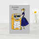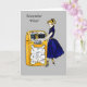Remember when is a hand drawn retro card of a young lady playing a juke box. She even has the wide skirt and buster brown shoes. The words on the inside can be changed.