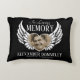Funeral memorial black pillow featuring a heart photo of your loved one in the centre of angel wings, the text "in loving memory", their name, and birth/death dates.