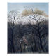 A beautiful forest landscape with two figures on horseback visible through the foliage of the forest.