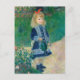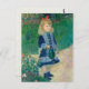 This delightful oil painting was painted by Pierre-Auguste Renoir in 1876. The lovely child is Mademoiselle Leclere, wearing a blue dress and holding a watering can. Renoir was in Impressionist. You can see that, rather than blend the colours of the painting, Renoir applied them with individual touches of the brush that dissolve edges and seem to shimmer with light. (The design you see on the inside of this postcard is a beautiful white floral jacquard fabric pattern.)