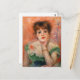 Renoir Jean Samary in a Low Necked Dress postcard. One of Renoir’s most charming portraits, his depiction of Jeanne Samary employs the sharp use of pink and green characteristic of the artist’s best work. The young red head leans towards the viewer, chin in hand, with a slight smile and light gaze of her blue eyes. The green dress she wears accentuates her shoulders and visage. A great gift for fans of Pirre-Auguste Renoir, impressionism, famous portraits, and French art.