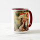Renoir Two Girls Reading in the Garden mug. Oil painting on canvas from 1890. Renoir often painted young children engaged in charming everyday activities. Two Girls Reading in a Garden is a bright summer work featuring two young girls wearing pretty hats with flowers and bows leaning over a book. One girl scans the text with a pencil while the other girl holds her head in her hand watching. A pretty gift for fans of Renoir, impressionism, and French art.