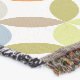 A repeat circular quarters cut out style patterned throw in warm tonal colours of yellow, orange, browns, olive green, grey and blue on a white background by Sarah Trett. Would look great in a bedroom, lounge room.