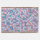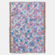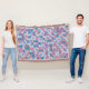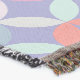 A repeat circular quarters cut out style patterned throw in purple pastel colours of purple, pink, coral orange, aqua and blue, by Sarah Trett. Would look great in a bedroom, lounge room.