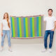 A repeat three colour bright dogtooth stripe patterned throw in lime green, blue and grey by Sarah Trett. Would look great in a bedroom, lounge room.