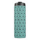 This thermal bottle has a mid-century modern design of squares with a line and a line of circles, all black, repeating across the design on a field of seafoam. If you like the design but prefer different colours, message me.