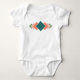 This baby bodysuit has a Bauhaus design of seven overlapping diamonds running vertically along the item in retro colors of blue, pink, and green.