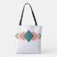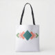 This tote bag has a Bauhaus design of seven overlapping diamonds running vertically along the item in retro colors of blue, pink, and green.