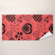 This towel set has a black washcloth, a red hand towel and a bath towel with a Valentine’s design of repeating hearts with different graphics inside on a field of red.