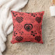 This throw pillow has a Valentine’s design of repeating hearts with different graphics inside on a field of red.