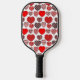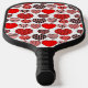 This pickleball paddle has a Valentine’s design of repeating hearts with different graphics inside on a field of white.